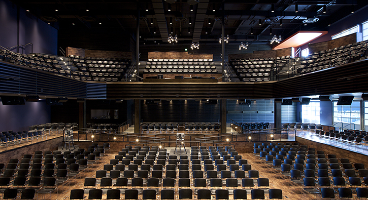 The auditorium, with seating for up to 1,500 people, is further enhanced by the state-of-the-art interior and exterior audio-visual systems. The technology encourages individual attendees to actively participate and interact together in real time.