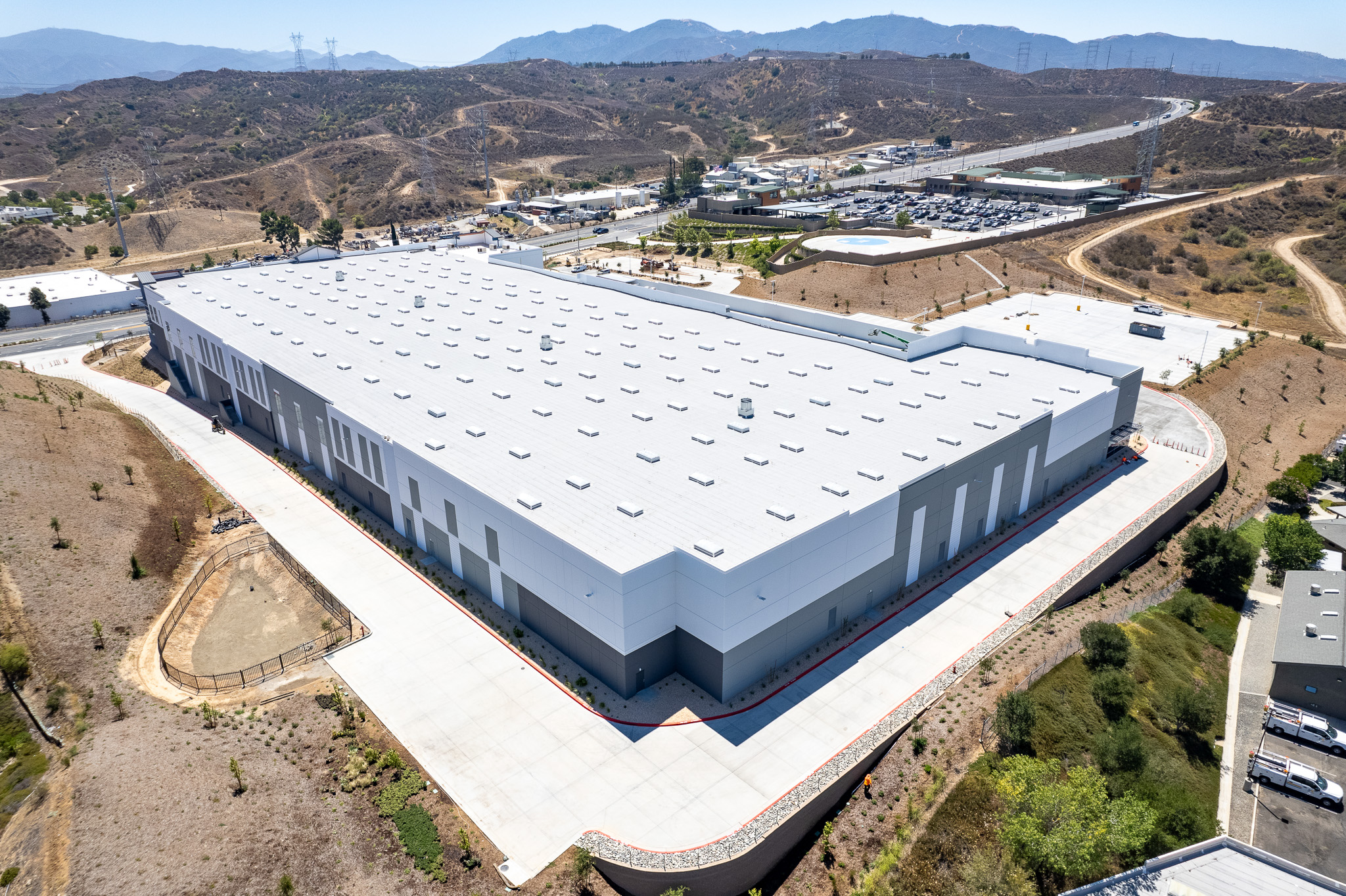 A defining element of the project is its complex site development, which required extensive grading and the construction of six mechanically stabilized earth (MSE) retaining walls totaling more than 1,000 linear feet. Built using the Anchor™ GeoHold Pro® system with Miragrid®geosynthetic reinforcement, the walls were engineered to meet California Building Codes and seismic standards. The facility also provides 219 auto parking stalls, 8 EV charging stations, and a fully concrete, fenced, and secured yard. The project is pursuing BREEAM (Building Research Establishment Environmental Assessment Method) certification, underscoring its commitment to performance,durability, and sustainability.